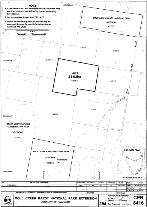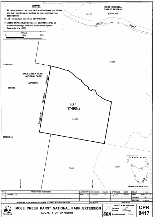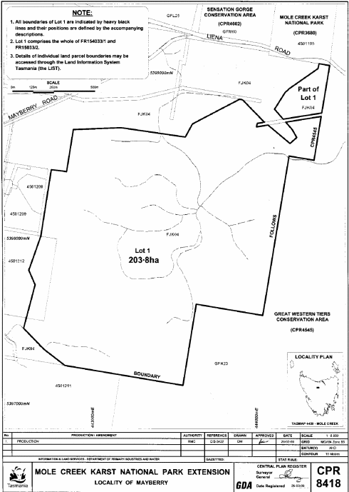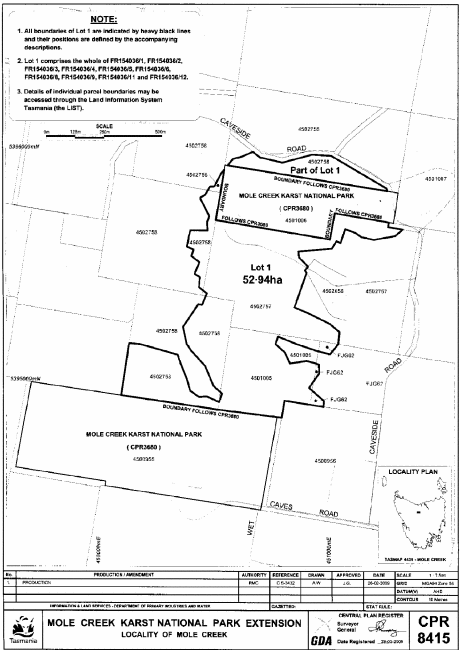 PART 1 - Mole CreekAll those areas of land comprising about 52.94 hectares, shown as Lot 1 and bounded by heavy black lines on Plan 8415 in the Central Plan Register, a reduced copy of which is set out, by way of illustration only, in Part 1 of Schedule 2 to this proclamation.