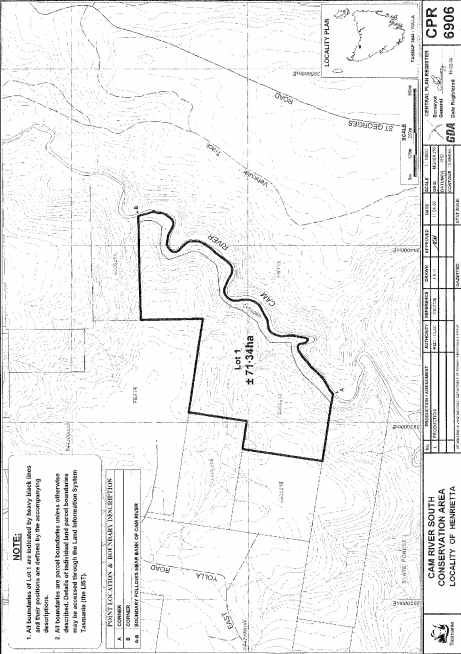 PART 1 - Cam River South Conservation AreaAll that area of land comprising about 71.34 hectares, shown as Lot 1 and bounded by a heavy black line on Plan 6906 in the Central Plan Register, a reduced copy of which is set out, by way of illustration only, in Part 1 of Schedule 2 to this proclamation.