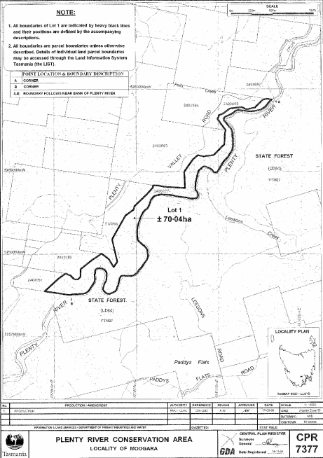 PART 8 - Plenty River Conservation AreaAll that area of land comprising about 70.04 hectares, shown as Lot 1 and bounded by a heavy black line on Plan 7377 in the Central Plan Register, a reduced copy of which is set out, by way of illustration only, in Part 8 of Schedule 2 to this proclamation.