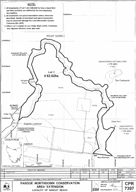 PART 7 - Pardoe Northdown Conservation AreaAll that area of land comprising about 62.62 hectares, shown as Lot 1 and bounded by a heavy black line on Plan 7397 in the Central Plan Register, a reduced copy of which is set out, by way of illustration only, in Part 7 of Schedule 2 to this proclamation.