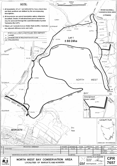PART 6 - North West Bay Conservation AreaAll that area of land comprising about 85.24 hectares, shown as Lot 1 and bounded by a heavy black line on Plan 7657 in the Central Plan Register, a reduced copy of which is set out, by way of illustration only, in Part 6 of Schedule 2 to this proclamation.