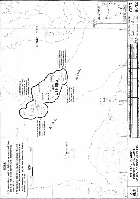 PART 10 - Wallaby Islands Conservation AreaAll that area of land comprising about 89.48 hectares, shown as Lot 1 and bounded by a heavy black line on Plan 8012 in the Central Plan Register, a reduced copy of which is set out, by way of illustration only, in Part 10 of Schedule 2 to this proclamation.