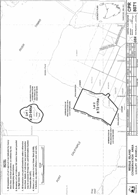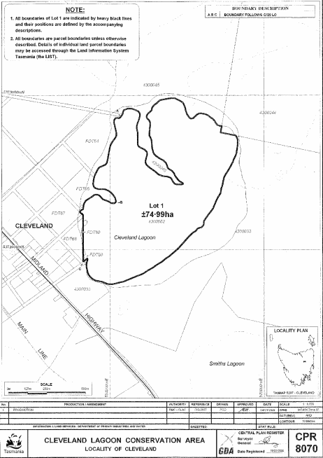 PART 2 - Cleveland Lagoon Conservation AreaAll that area of land comprising about 74.99 hectares, shown as Lot 1 and bounded by a heavy black line on Plan 8070 in the Central Plan Register, a reduced copy of which is set out, by way of illustration only, in Part 2 of Schedule 2 to this proclamation.