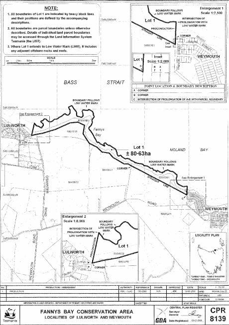 PART 4 - Fannys Bay Conservation AreaAll that area of land comprising about 80.63 hectares, shown as Lot 1 and bounded by a heavy black line on Plan 8139 in the Central Plan Register, a reduced copy of which is set out, by way of illustration only, in Part 4 of Schedule 2 to this proclamation.