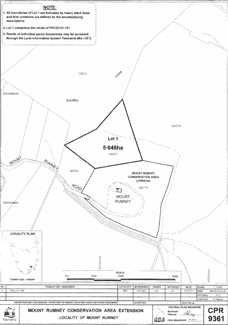 PART 2 - Mount Rumney Conservation AreaAll that area of land comprising about 5.646 hectares, shown as Lot 1 and bounded by a heavy black line on Plan 9361 in the Central Plan Register, a reduced copy of which is set out, by way of illustration only, in Part 2 of Schedule 2 to this proclamation.