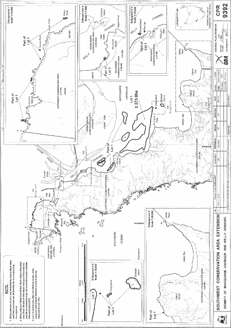 PART 3 - Southwest Conservation AreaAll that area of land comprising about 273.8 hectares, shown as Lot 1 (in 18 parts) and bounded by heavy black lines on Plan 9392 in the Central Plan Register, a reduced copy of which is set out, by way of illustration only, in Part 3 of Schedule 2 to this proclamation.