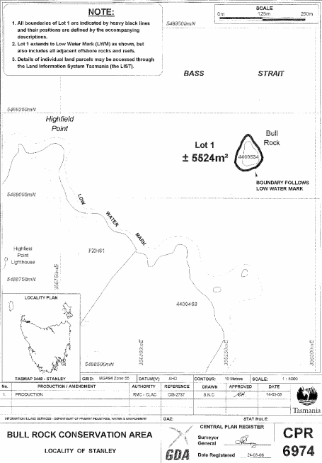 (b) the Crown land specified in Part 2 of Schedule 1 to this proclamation to be reserved land in the class of conservation area and give the name Bull Rock Conservation Area to that reserved land; and