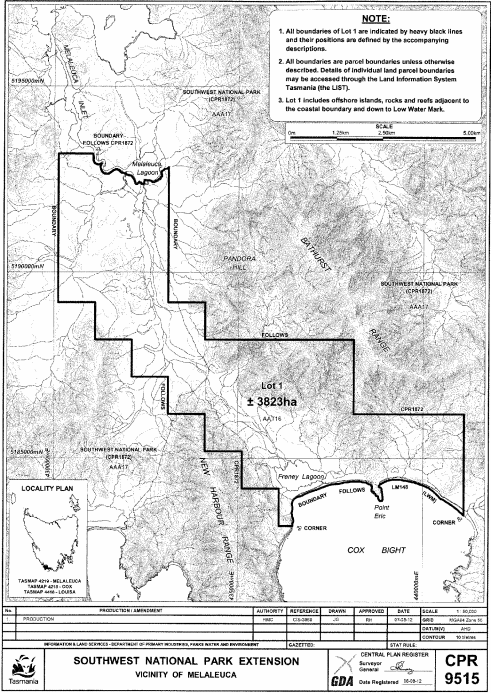 17 December 2012(a) the reserved land specified in Schedule 1 to this proclamation, being an area of land in the vicinity of Melaleuca reserved in the class of conservation area, to be reserved land in the class of national park and give the name Southwest National Park to that reserved land; and(b) that this proclamation takes effect on the day on which its making is notified in the Gazette.