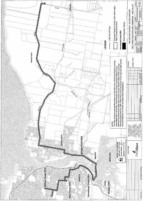 (1) In this clause pipeline means the pipeline that (a) is referred to in the licence granted under section 24 of the Act to Tas Gas Networks Pty Ltd on 14 July 2003, as amended; and(b) extends from the William Street District Regulator Station and terminates at (i) the point situated at 445,149.0E and 5,440.881.8N; and(ii) the point situated at 445,912.8E and 5,440,167.6N; and(iii) the point situated at 454.657.5E and 5,441,267.7N; and(c) is shown bounded by a heavy, black, broken line on Plan 9754 in the Central Plan Register, a reduced copy of which is set out, by way of illustration only, in Schedule 1 to this order.(2) A planning corridor is declared in respect of the pipeline.(3) The planning corridor declared in respect of the pipeline (a) extends along the length of the pipeline and is 25 metres wide on each side of the pipeline; and(b) extends away from each end of the pipeline in a semicircle with a radius of 25 metres from the centre-line at that end of the pipeline.(4) For the purposes of subclause (3)(a) of this clause, the width of each side of the planning corridor in respect of the pipeline is measured (a) from the centre-line of the pipeline; and(b) at a right angle from the centre-line of the pipeline.