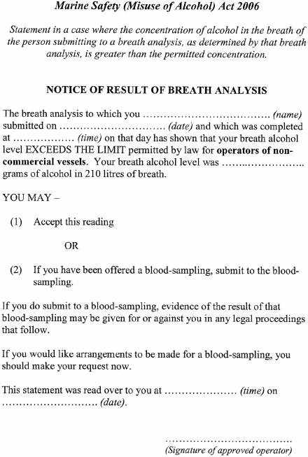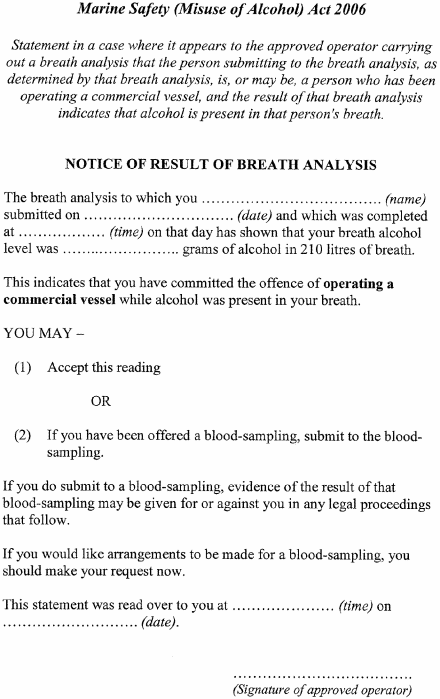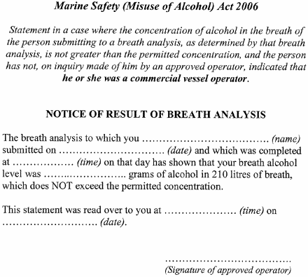 For section 29 of the Act, the written statement is to be in accordance with (a) Form 2 in a case where the concentration of alcohol in the breath of the person submitting to the breath analysis, as determined by the breath analysis, is greater than the permitted concentration; and(b) Form 3 in a case where (i) it appears to the approved operator carrying out the breath analysis that the person submitting to the breath analysis is, or may be, a person who has been operating a commercial vessel; and(ii) the result of the breath analysis indicates that alcohol is present in that person's breath; and(c) Form 4 in a case where (i) the concentration of alcohol in the breath of the person submitting to the breath analysis, as determined by the breath analysis, is not greater than the permitted concentration; and(ii) that person has not, in answer to an inquiry made by an approved operator, indicated that he or she has been operating a commercial vessel.