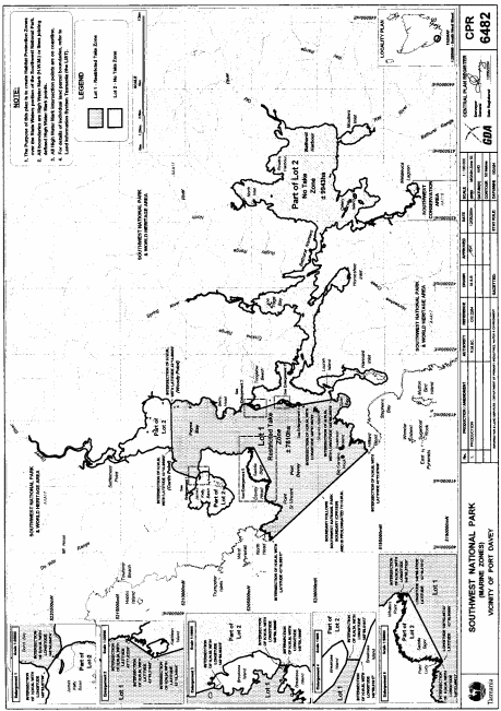 PART 1 - Restricted take zoneThe restricted take zone for the Southwest National Park is the area of water comprising approximately 7 810 hectares, shown as Lot 1 with coordinates expressed using Geocentric Datum of Australia and bounded by a heavy black line on Plan 6482 in the Central Plan Register, a reduced copy of which is set out, by way of illustration only, in Part 2 of this Schedule.