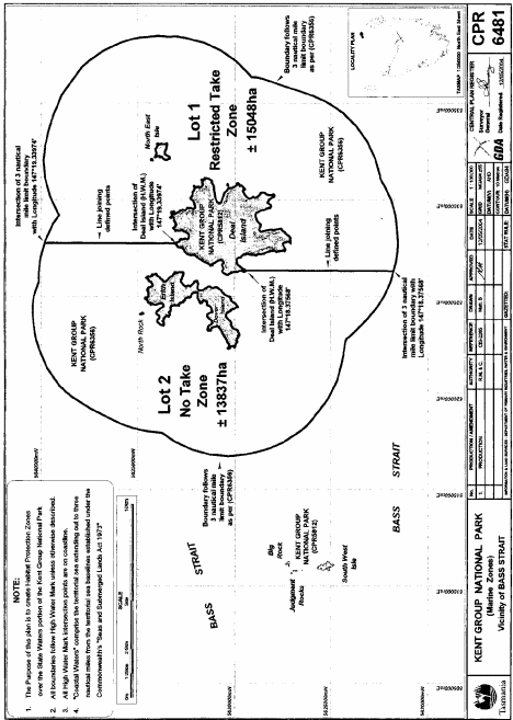 PART 1 - Restricted take zoneThe restricted take zone for the Kent Group National Park is the area of water comprising approximately 15 048 hectares, shown as Lot 1 with coordinates expressed using Geocentric Datum of Australia and bounded by a heavy black line on Plan 6481 in the Central Plan Register, a reduced copy of which is set out, by way of illustration only, in Part 2 of this Schedule.