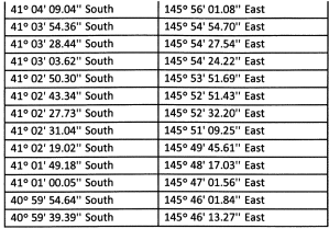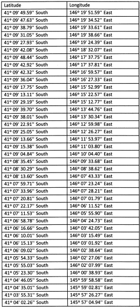 (1) The area consisting of is specified to be a sensitive area in relation to the sensitive wildlife specified in clause 4 .(a) the area of land bounded on its seaward side by the mean low water mark and on its landward side by an imaginary line extending directly between the points specified in the following paragraphs:(i) latitude 41°5257.87 south, longitude 148°1814.78 east;(ii) latitude 41°5247.45 south, longitude 148°1733.66 east;(iii) latitude 41°5213.00 south, longitude 148°1638.48 east;(iv) latitude 41°5118.93 south, longitude 148°1550.08 east;(v) latitude 41°5104.36 south, longitude 148°1628.91 east; and(b) each area of land bounded by an imaginary line encircling, at the mean low water mark, an island (including Diamond Island and Governor Island) that is situated within 0.5 nautical miles seawards of any part of the area of land referred to in paragraph (a) ; and(c) all rocky outcrops, above the mean low water mark, situated within 0.5 nautical miles seawards of any part of the area of land referred to in paragraph (a) (2) The area specified in subclause (1) is shown, for general information purposes only, on the map in Schedule 3 to this order.
