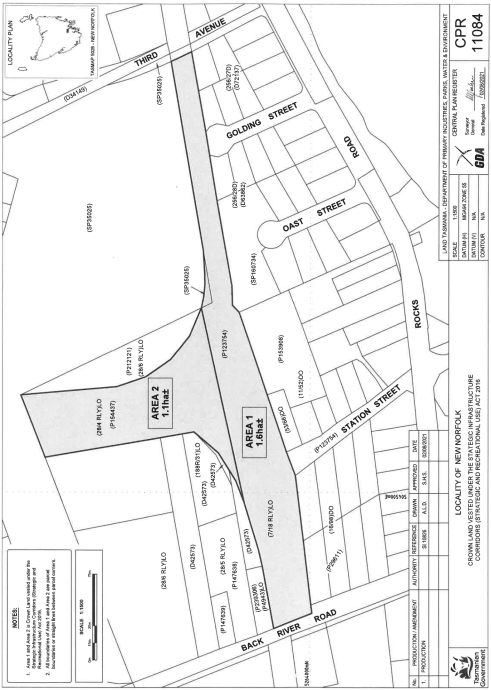 (1) The areas of land identified as Area 1 and Area 2 on Plan 11084 in the Central Plan Register are (a) designated to be land within a corridor; and(b) declared to be a strategic infrastructure corridor; and(c) assigned the name Derwent Valley Corridor from Third Avenue to Back River Road.(2) A reduced copy of Plan 11084 in the Central Plan Register is set out, by way of illustration only, in Schedule 1 , to this notice.