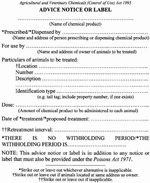 When supplying a veterinary chemical product to a person, the veterinary surgeon or the person who supplies the veterinary chemical product in compliance with the prescription of a veterinary surgeon is also to provide that person with the advice notice or label required under section 18(1)(d) of the Act relating to the veterinary chemical product.