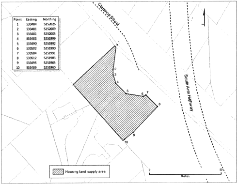 (a) is situated at Clarence Street, Howrah in Tasmania; and(b) forms part of the land as described in the certificate of title Volume 6109, Folio 1 of the Register kept under section 33 of the Land Titles Act 1980 ; and(c) is within the boundary made by the following imaginary lines:(i) a line between grid reference 533484E 5252026N and grid reference 533481E 5252009N;(ii) a line between grid reference 533481E 5252009N and grid reference 533481E 5252005N;(iii) a line between grid reference 533481E 5252005N and grid reference 533483E 5251999N;(iv) a line between grid reference 533483E 5251999N and grid reference 533490E 5251992N;(v) a line between grid reference 533490E 5251992N and grid reference 533502E 5251990N;(vi) a line between grid reference 533502E 5251990N and grid reference 533504E 5251991N;(vii) a line between grid reference 533504E 5251991N and grid reference 533512E 5251983N;(viii) a line between grid reference 533512E 5251983N and grid reference 533495E 5251965N;(ix) a line between grid reference 533495E 5251965N and grid reference 533489E 5251960N;(x) a line from grid reference 533489E 5251960N to the north-westernmost corner of the land specified in that certificate of title;(xi) a line from that north-westernmost corner referred to in subparagraph (x) to grid reference 533484E 5252026N; and(d) is shown as the shaded area, bounded by heavy black lines, on the plan set out, by way of illustration only, in Schedule 2 to this order.