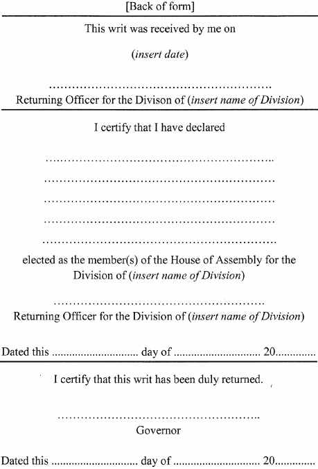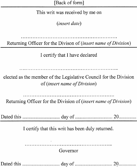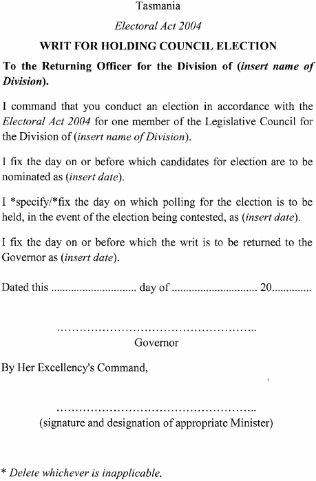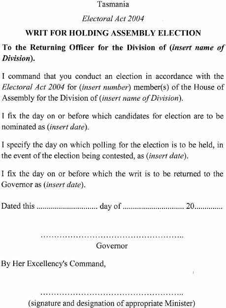 For the purposes of section 67 of the Act (a) a writ for the holding of an Assembly election is to be in accordance with Form 1; and(b) a writ for the holding of a Council election is to be in accordance with Form 2.